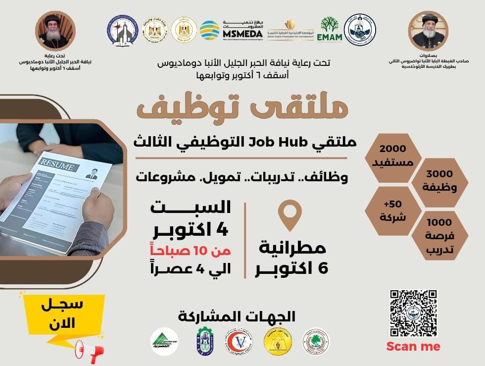 أعلنت خدمة التوظيف - مكتب التنمية بإيبارشية ٦ أكتوبر  وأوسيم عن ملتقى توظيفي بكنيسة السيدة العذراء والقديس مار مرقس الرسول (مقر المطرانية) في الرابع من أكتوبر القادم.