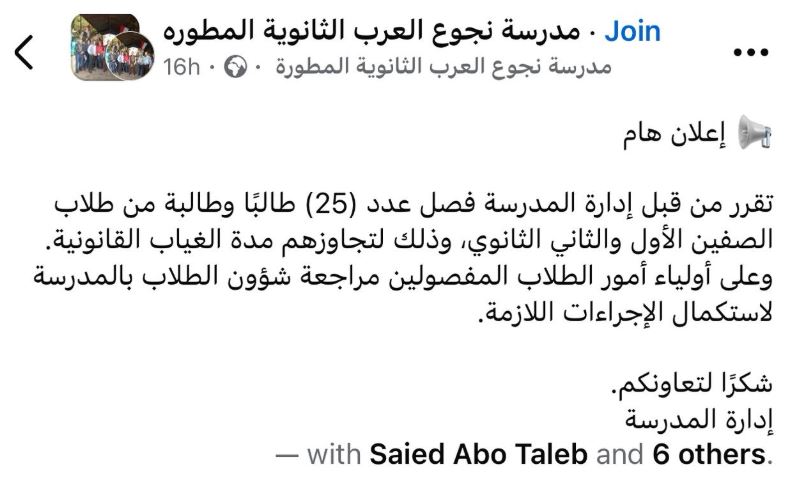 حيث أصدرت إدارة العمرانية التعليمية بمحافظة الجيزة ، بيانا رسميا أعلنت خلاله أنه حرصاً على مصلحة الطلاب وانتظام العملية التعليمية، ونظراً لتجاوز عدد كبير من طلاب الصفين الأول والثاني الثانوي لنسبة الغياب المقررة خلال الفترة الماضية سواء غيابًا متصلاً أو منفصلاً ، فقد تم اليوم الخميس الموافق ١٦ / ١٠ / ٢٠٢٥ اتخاذ الإجراءات الآتية: