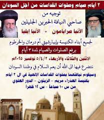 في ظلّ الأوضاع الإنسانية الصعبة التي يشهدها السودان، ولا سيّما في مدينة الفاشر التي تعاني تدهورًا خطيرًا في الأوضاع المعيشية والأمنية، بدأ الأقباط السودانيون اليوم صيامًا وصلواتٍ لمدة ثلاثة أيام من أجل إحلال السلام في البلاد، بتوجيهٍ من نيافة الأسقفين الأنبا صرابامون أسقف أم درمان وعطبرة والأنبا إيليا أسقف الخرطوم وجنوب السودان .