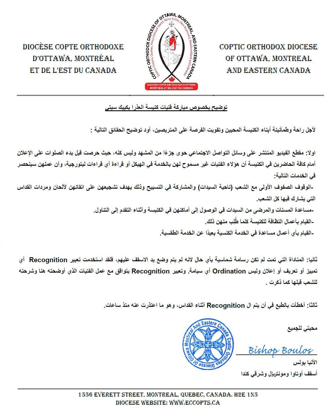 ثانياً: المناداة التي تمت لم تكن رسامة شماسية بأي حال لأنه لم يتم وضع يد الأسقف عليه، فلقد استخدمت تعبير Recognition أي تمييز أو تعريف أو إعلان وليس Ordination أي سيامة، وتعبير Recognition يتوافق مع عمل الفتيات الذي أوضحته هنا وشرَّحته للشعب فبلها كما ذكرت.