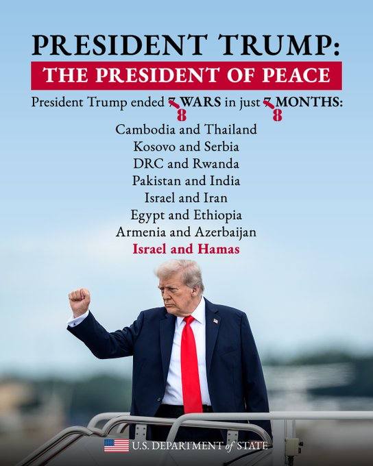 وأرفقت التغريدة بصورة لترامب أثناء نزوله من الطائرة، إلى جانب قائمة تضمنت نزاعات قالت الوزارة إنه ساهم في إنهائها بين دول مثل كمبوديا وتايلاند، كوسوفو وصربيا، الكونغو الديمقراطية ورواندا، باكستان والهند، إسرائيل وإيران، مصر وإثيوبيا، أرمينيا وأذربيجان، إضافة إلى إسرائيل وحماس.