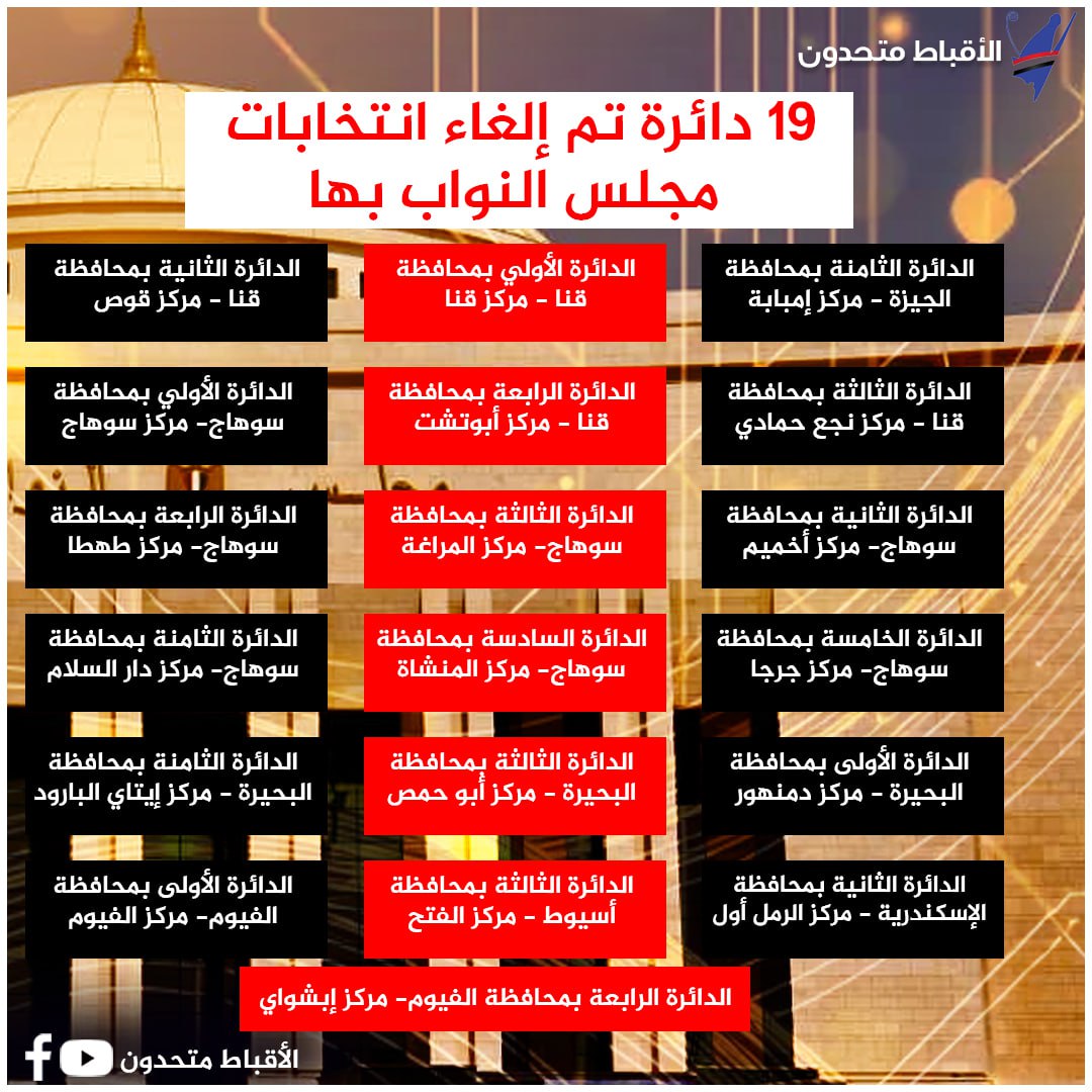 أعلن القاضي حازم بدوى رئيس الهيئة الوطنية للانتخابات، خلال مؤتمر إعلان النتيجة الرسمية للمرحلة الأولى من انتخابات مجلس النواب إلغاء الانتخابات فى 19 دائرة انتخابية وهى 1 بالجيزة و4 دوائر فى قنا و7 فى سوهاج و2 فى الفيوم و1 فى الإسكندرية و3 فى البحيرة.