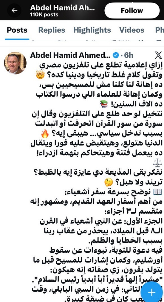 أثار منشور الكاتب عبدالحميد أحمد حمدي - علي منصة إكس - حالة من الجدل والانتقاد، عقب تصريحات إعلامية وُصفت بأنها «غير دقيقة تاريخياً ودينياً»، تناولت «سفر أشعياء» أحد أسفار العهد القديم، بما اعتبره إساءة للتراث الديني والعلمي معاً.