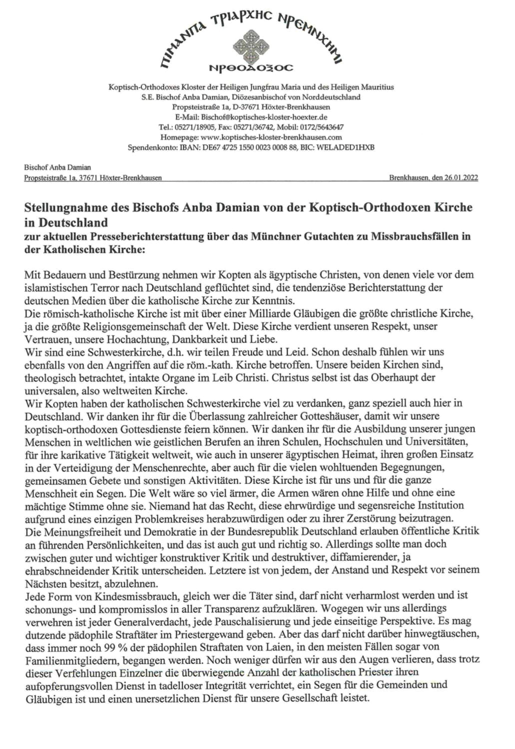 نحن كنيسة أخت، مما يعني أننا نشارك الفرح والحزن. لهذا السبب نشعر أن الهجمات على الكنيسة الكاثوليكية تقع علينا نحن أيضا. من الناحية اللاهوتية، كلا كنيستينا أعضاء حقيقية في جسد المسيح.المسيح نفسه هو رأس الكنيسة في العالم كله. نحن الأقباط نشكر الكنيسة الكاثوليكية الشقيقة كثيرًا، خاصة هنا في ألمانيا.نشكرها، ليس فقط، على توفير العديد من دور العبادة حتى نتمكن من القيام بخدماتنا القبطية الأرثوذكسية. نشكرها أيضًا على تدريب شبابنا في المهن الحرفية والروحية في مدارسها وكلياتها وجامعاتها، نشكرها كذلك على عملها الخيري في جميع أنحاء العالم، وكذلك في وطننا الاصلي مصر،والتزامها الكبير بالدفاع عن حقوق الإنسان، ونشكرها أيضًا من أجل العديد من الاجتماعات الهامة والصلاة المشتركة وغيرها من الأنشطة.هذه الكنيسة نعمة لنا وللبشرية جمعاء. سيكون العالم أكثر فقرًا، وسيكون الفقراء بدون مساعدة وبدون صوت قوي بدون هذه الكنيسة. لا يحق لأحد التقليل أو المساهمة في تدمير هذه المؤسسة الجليلة المباركة على أساس قضية واحدة. تسمح حرية التعبير والديمقراطية في جمهورية ألمانيا الاتحادية بالنقد العلني للشخصيات القيادية، وهذا أمر جيد. ومع ذلك، يجب على المرء أن يميز بين النقد البناء الجيد والمهم والنقد الهدام والتشهيري. يجب رفض هذا النوع الأخير من قبل أي شخص لديه اللياقة والاحترام لأخيه الإنسان. يجب عدم التقليل من أي شكل من أشكال إساءة معاملة الأطفال، بغض النظر عن الجناة، ويجب التخلص منه بلا هوادة و بكل شفافية. ولكن ما نرفضه هو الاثارة غير الموضوعية للشكوك بشكل عام وأي تعميم وأي منظور أحادي الجانب. قد يكون هناك العشرات من المعتدين على الأطفال في الجلباب الكهنوتي.ولكن هذا لا يجب أن يخفي حقيقة أن (99٪) من جرائم الاستغلال الجنسي للأطفال ما زالت تُرتكب من قبل أشخاص عاديين ، حتى من قبل أفراد الأسرة في معظم الحالات.لا ينبغي لنا أن نغفل عن حقيقة أنه على الرغم من سوء السلوك من قبل نسبة ضئيلة جدا جدا من الكهنة، فإن الغالبية العظمى من الكهنة الكاثوليك يؤدون خدمتهم في التضحية بالنفس بنزاهة لا تشوبها شائبة ، وهم نعمة للجماعات والمؤمنين ويقدمون خدمة لا غنى عنها لمجتمعنا. تتطلب أزمة الثقة التي نشأت عن إساءة استخدام وسائل الإعلام إجابة عملية، يجب تنفيذ خطة بناءة وتطلعية لاستعادة ثقة الجمهور في الكنيسة بقوة من أجل تجنب العواقب المميتة للتخلص من الكنيسة، وهو ما قد يؤدى إلى إزالة المسيحية من المجتمع الألماني. يجب أن تكون الاستثمارات المكثفة في تربية الأطفال والشباب بهدف الاندماج المبكر في الحياة الكنسية في قلب هذه الخطة للمستقبل ويجب أن تكون محورًا جديدًا للخدمة الكنسي. يجب مواجهة سوء سلوك من يخطيء من قادة الكنيسة بأمانة ونزاهة وشفافية،ولكن يجب عدم إساءة استخدامه في الحملات السياسية أو الأيديولوجية. يجب أن يتم وضع اخطاؤهم في حجمها الحقيقي ومقارنتها بشكل عادل وحيادي مع سوء سلوك قادة الطوائف والأديان والفلسفات والأيديولوجيات السياسية على هذه الأرض.