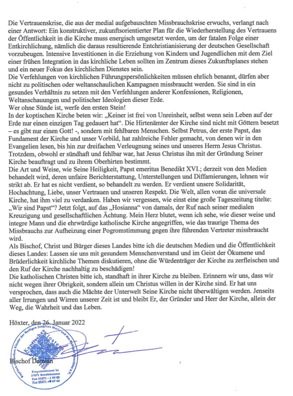 بصفتي أسقفًا مسيحيًا ومواطنًا في هذا البلد، أطلب من وسائل الإعلام الألمانية والجمهور في هذا البلد:دعونا نناقش قضايا الكنيسة بالفطرة السليمة وبروح المسكونية والأخوة، دون تمزيق قادة الكنيسة إلى أشلاء وبدون الإضرار بسمعة الكنيسة!