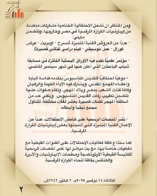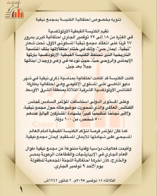 وجاء في البيان:"تقيم الكنيسة القبطية الأرثوذكسية في الفترة من ١٨ إلى ٢٢ نوفمبر الجاري احتفالية كبرى بمرور ١٧ قرنًا على انعقاد مجمع نيقية المسكوني الأول، تحت شعار "نيقية.. إيمان حي"، وذلك في ختام احتفالاتها بتلك المناسبة التاريخية التى تحتفظ الكنيسة القبطية الأرثوذكسية بإرثها الإيماني والروحي حيًّا، حيث تودعه في وعي ووجدان أبنائها جيلاً بعد جيل.